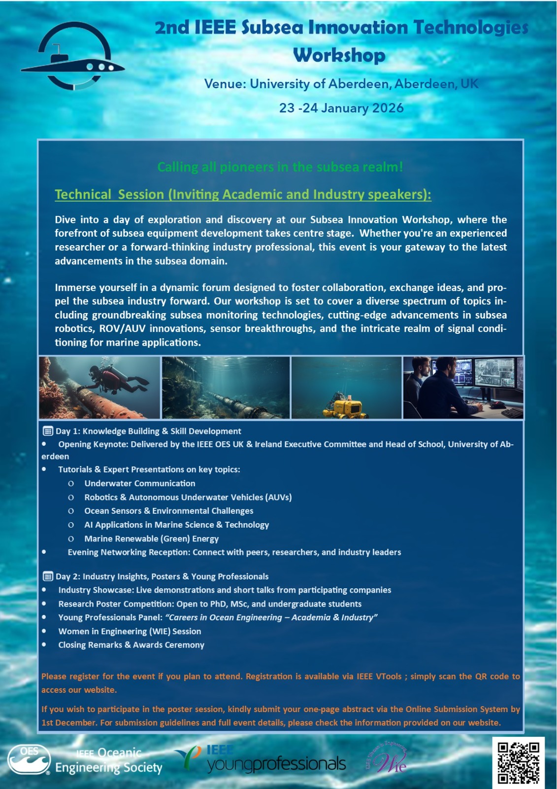 The 2nd IEEE Subsea Innovation Technologies Workshop will be held in Aberdeen, Scotland, between 23rd and 24th January, 2026.